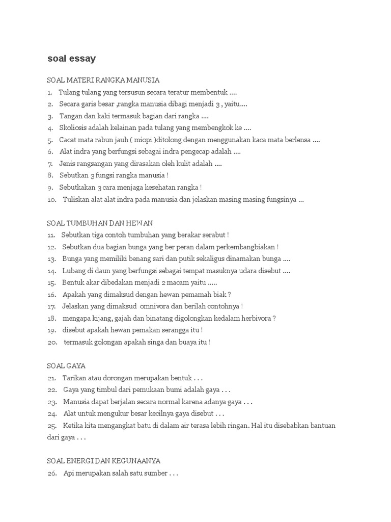 Kumpulan soal ini bisa dijadikan sebagai rujukan 20 contoh soal essay / uraian uts ipa kelas 3 sd semester 1 dan kunci jawaban. Postingan 50 soal lebih ilmu pengetahuan sosial kelas vii semester ganjil ini, berisikan materi yang sama dengan 45 contoh soal pg ips kelas 7 sebelumnya, yaitu tentang manusia, tempat, dan lingkungan (bab 1). We do everything possible to soal essay ipa kelas 6 un give professional essays to every student, and we ensure their comfort while they are soal essay ipa kelas 6 un using our services. We can help with that too, crafting soal essay ipa kelas 7 lapisan bumi a course paper, a dissertation, etc.